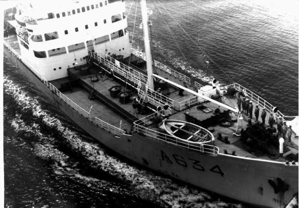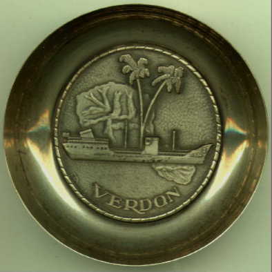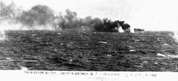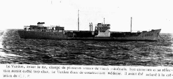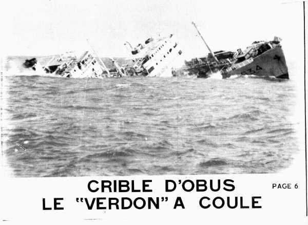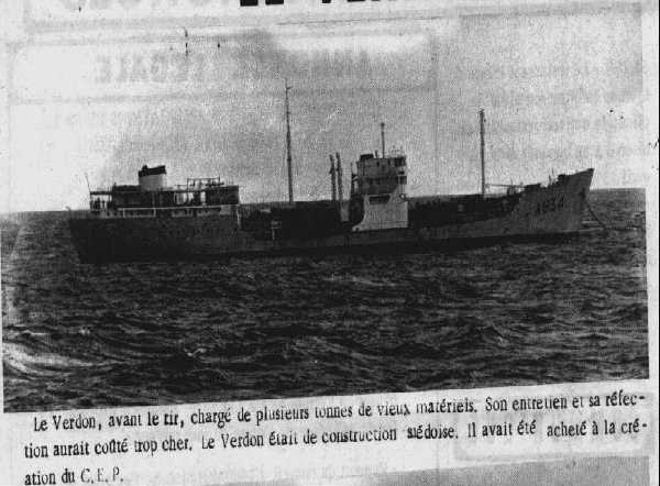 La carcasse du VERDON , décortique de tout ce qui a pu être récupérée et chargée de vieux pontons et de barcasses perdues, a été coulée, hier matin , au coup d'un exercice de tir, par l'aviso AMIRAL CHARNER et L'Enseigne de Vaisseau HENRY.